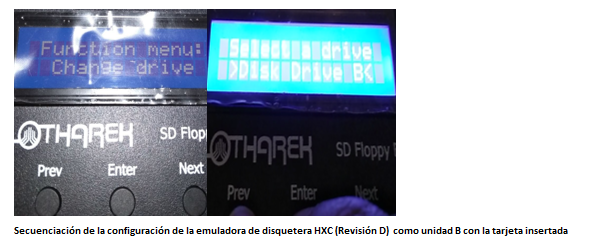 • Con el emulador HXC con la tarjeta, pulsamos el botón Enter, dejándolo pulsado hasta que no salga una pantalla que pone Function menú: Change Drive, pulsamos el botón Enter y seleccionamos en la pantalla Disk Drive B, pulsamos Enter para que nos salga la pantalla Drive B Selected y automáticamente regresamos a la pantalla norma de HXC donde están los disquetes.